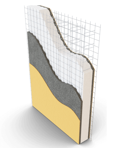يتكون الجدار المفرد من البولسترين الممدد، ومحاط بشبكة أسلاك الفولاذ المجلفن المزدوجة مرتبطة بالموصلات، ثم بطبقتين من الخرسانة المقذوفة مع التطبيق من اللياسة الهيكلي على كلا الجانبين.